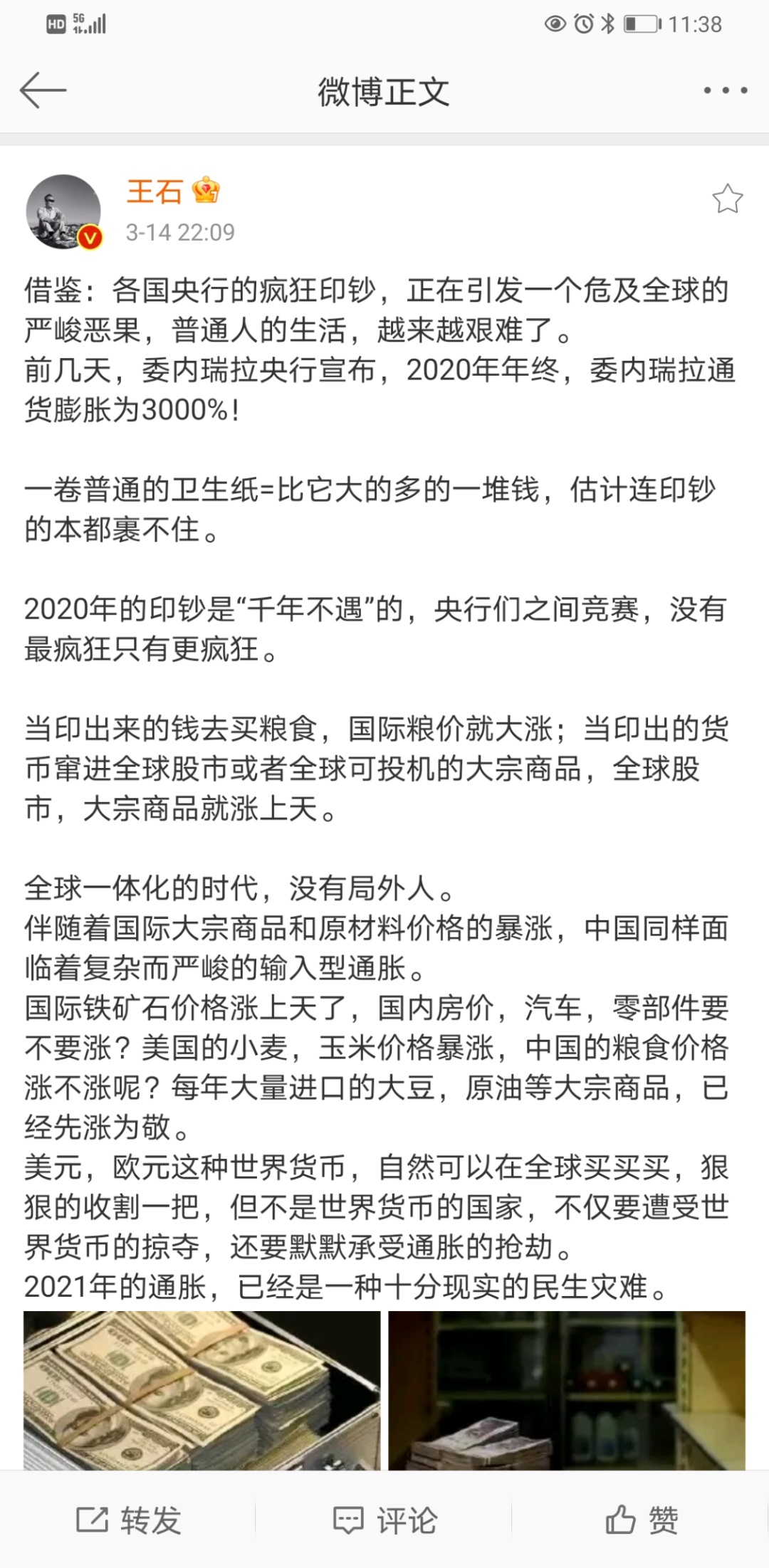 前天,王石发了一则微博,认为2020年的印钞是“千年不遇”的,通胀“洗劫”已侵入每个人的生活。